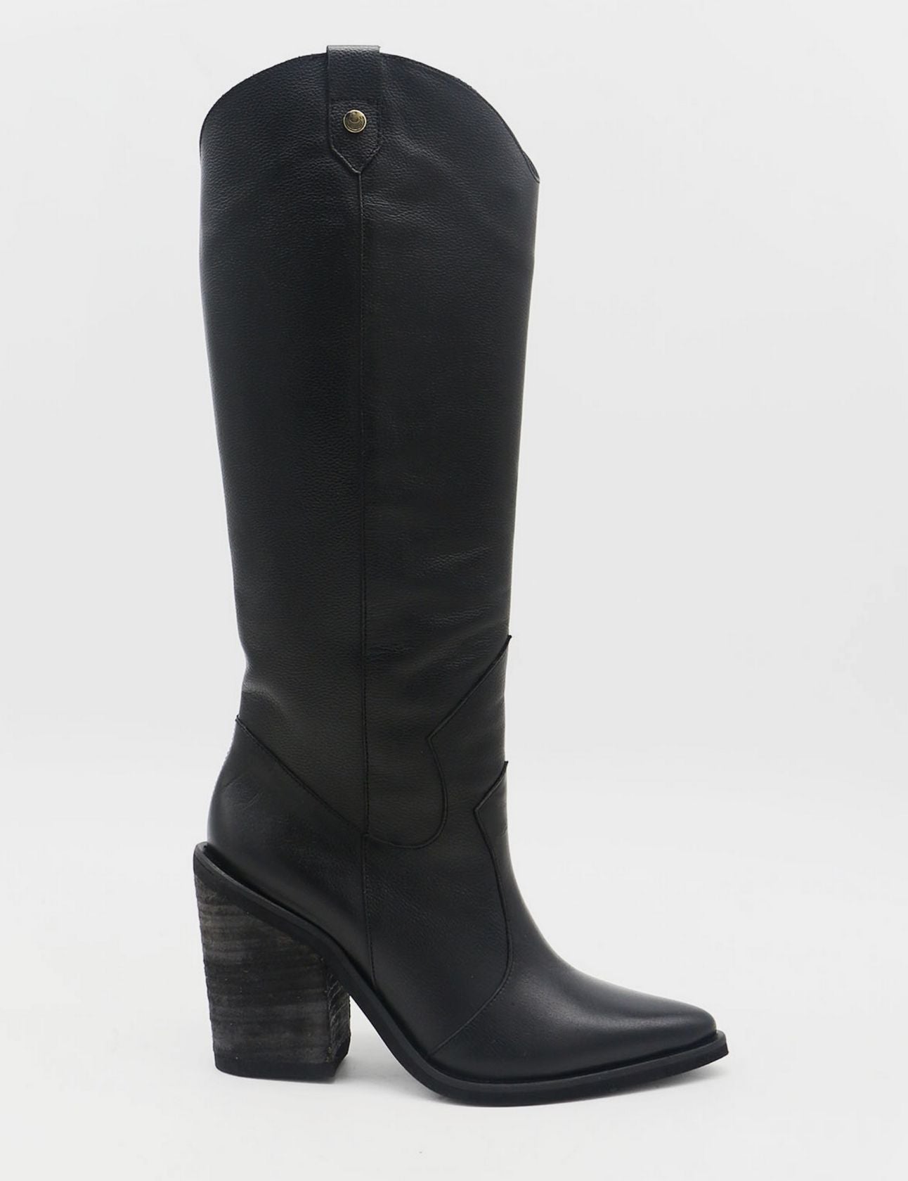 side profile of black leather macao western inspired knee high boots