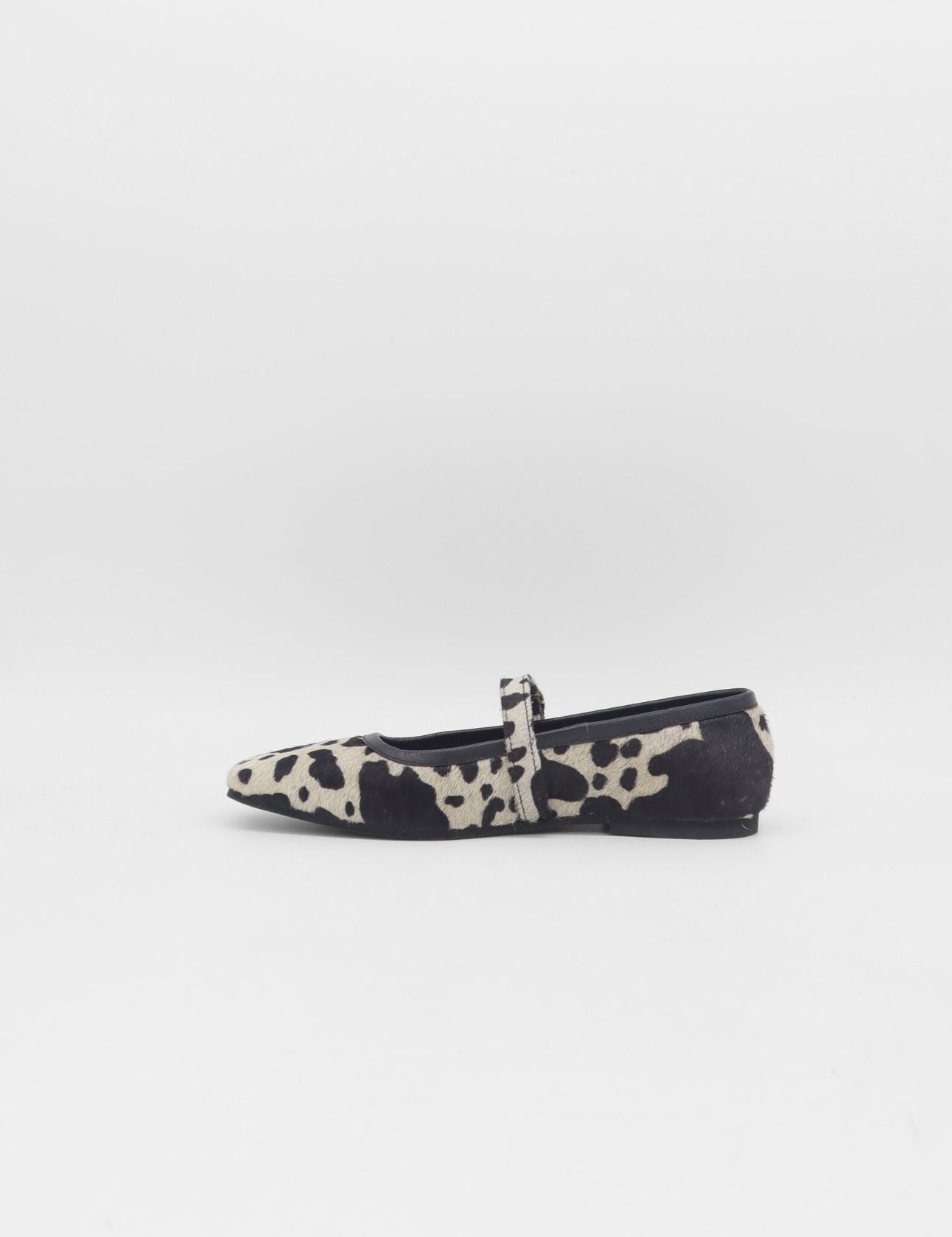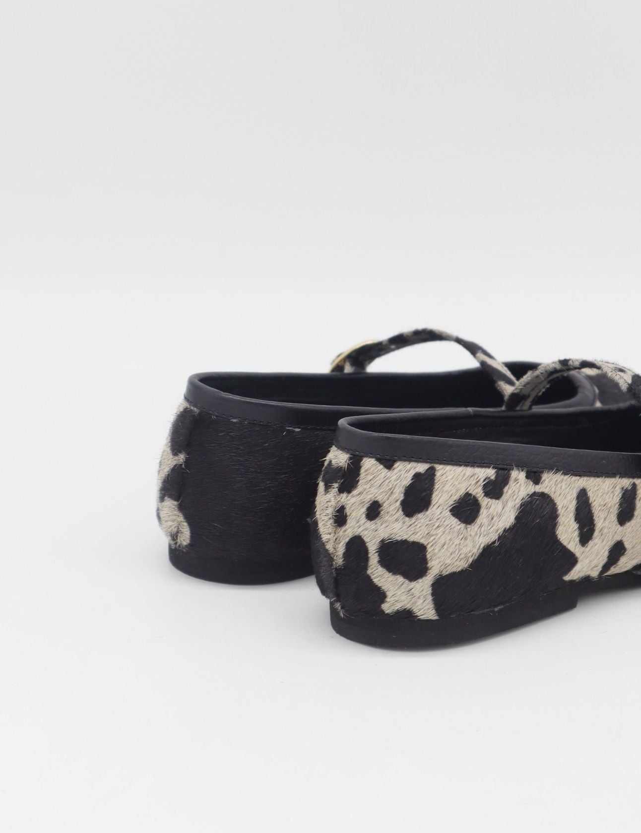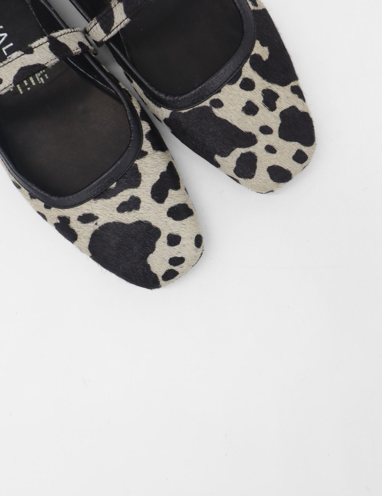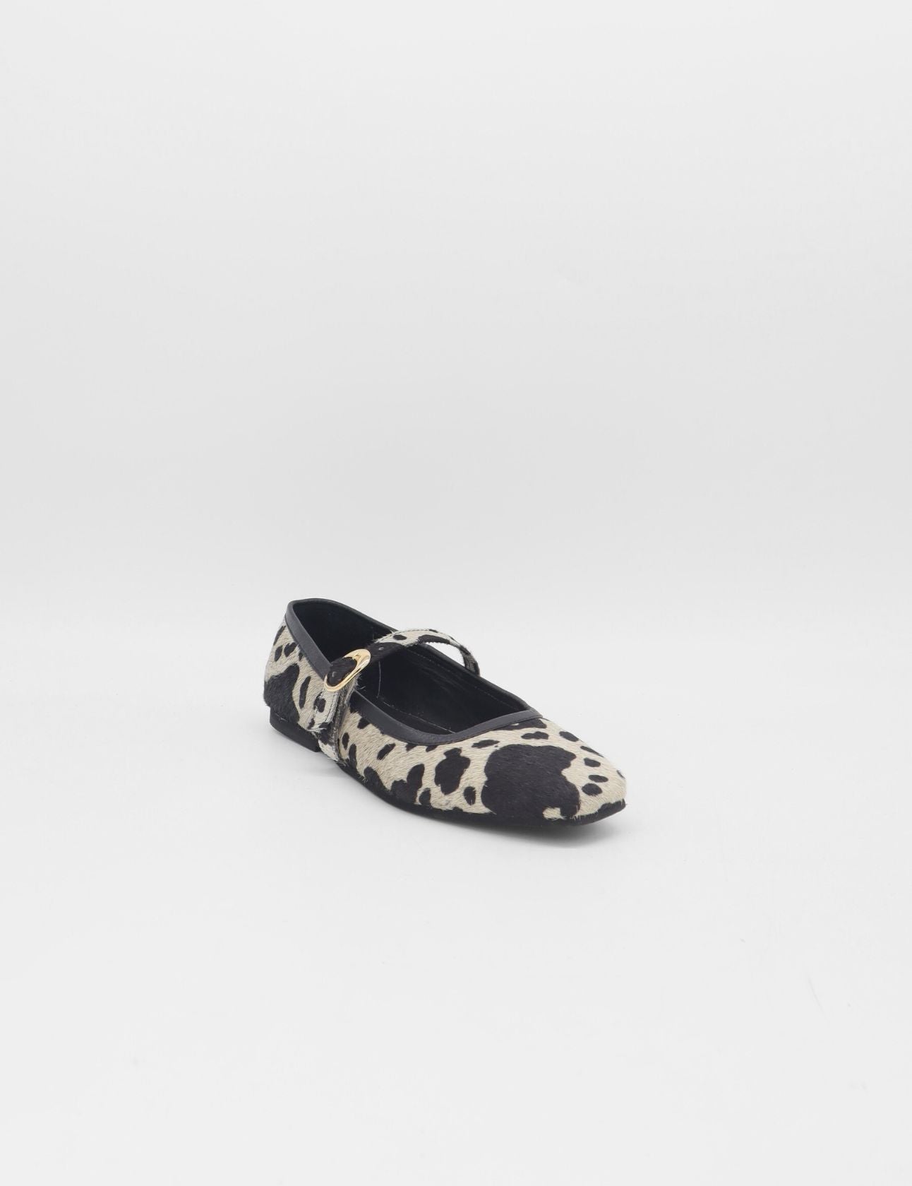 This flat features textured cowhide in a striking black-and-ivory spotted design, paired with a slim buckle strap for a polished finish. A modern, statement-making take on a timeless ballet-inspired silhouette, it’s designed to elevate everyday looks with ease.