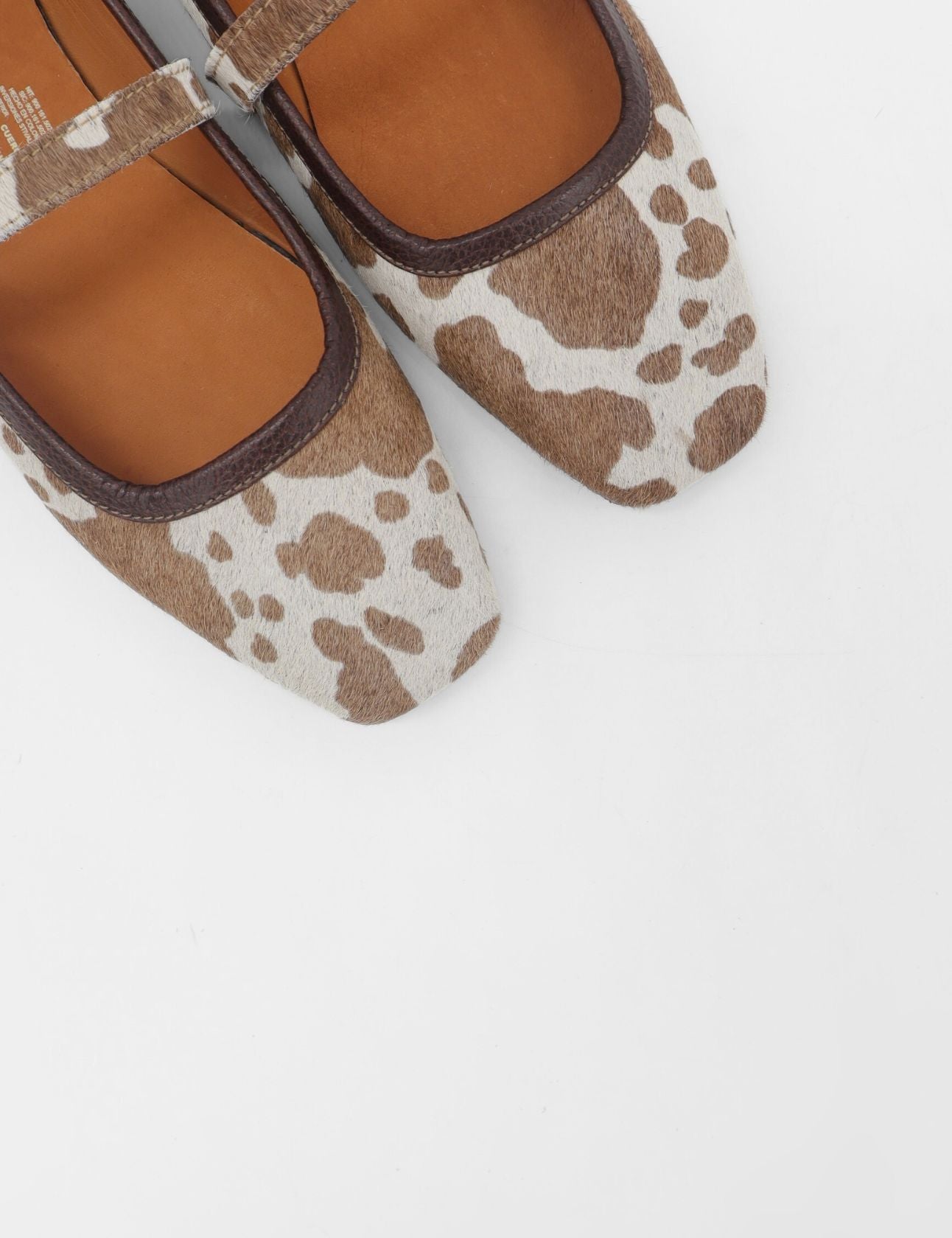This flat features textured cowhide in a striking tan-and-ivory spotted design, paired with a slim buckle strap for a polished finish. A modern, statement-making take on a timeless ballet-inspired silhouette, it’s designed to elevate everyday looks with ease.